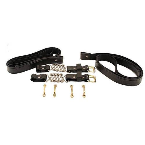 Accessory black leather straps with stainless steel zig-zag springs in the middle. They have a buckle just above the spring so you can adjust them to any T hood. Comes with footman loops for mounting. Straps adjust to a maximum of 72". Straps are 1-1/4" wide. Often used on speedsters when hood side panels are not being used.This set has brass buckles and brass footman loops. U.S.A.