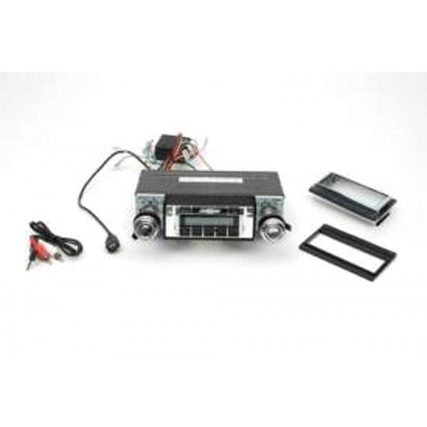 Fits In Stock Dash With No Modifications 240 Watts Total Power (60 x 4) Includes Auxiliary Inputs For iPod, DVD & Satellite Hookups Also Includes USB Port For Flash Memory MP3 Or WMA Playback No Cassette Player Included Electronic Tuner The USA-630 is the very latest technology available from Custom Autosound. The large OEM style pushbuttons look very similar to the ones on your original Chevelle radio. The unique USB port is on an 18 extension out the back of the stereo to allow placement in the glove box or other remote location. The display is now 30% larger than older designs giving improved visibility and song/artist/album title display during MP3 playback. Additional features include: balance, power antenna lead, bass, treble, fader, scan 12FM/4AM station presets & RCA preouts. The USA-630 stereo also includes faceplate, knobs & bezels.