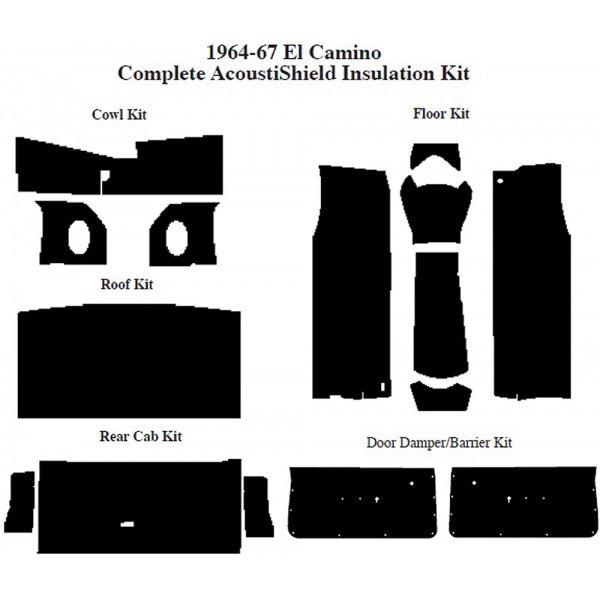 Best Quality Sound Deadener For El Camino Kit Does Roof, Floor, Rear Cab Wall, Inner Cowl & Doors Of Your El Camino Heat Barrier & Sound Deadener All In One Complete Kit Kit Includes: Pre-cut Sound Dampener Pads Pre-cut Heat Shield Barrier Pads Complete Instructions Spray Adhesive Aluminum Seam Tape Introducing a multi-stage, automotive insulation and sound damping system to give older El Caminos the ?quiet riding comfort? found in today's new vehicles coming off automotive assembly lines. These kits are designed on current, ?state-of-the-art? auto acoustic technology, to insulate and control the noise, vibration and heat in the passenger cabin. These kits are pre-cut and ready-to-install in a couple of hours, with easy-to-follow illustrated instructions--everything you need to do the job right.