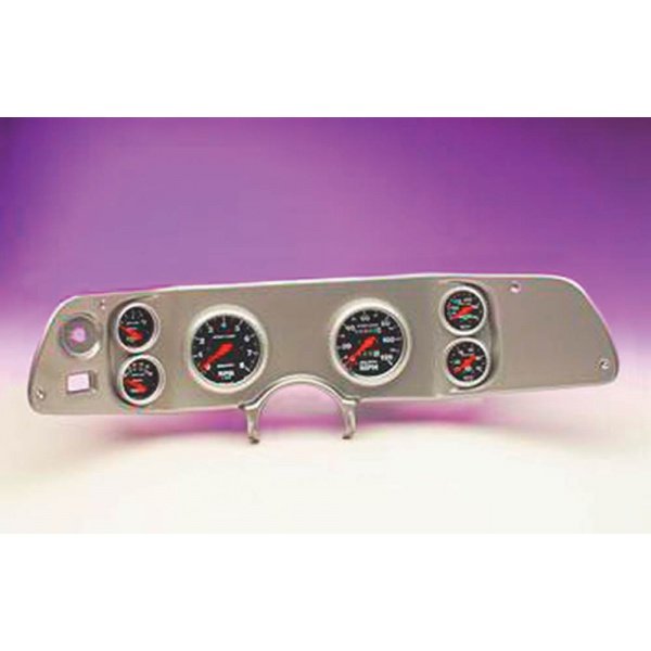 All new molded ABS instrument panel with a aluminum finish will replace the original gauge housing. This panel comes with AutoMeter Sport Comp II Gauges. These clusters are complete with wiring harness, oil and temp sending units, turn signal, high beam indicators, 3-3/8 160 MPH Speedometer, 10,000 RPM Tachometer, 2-1/16 Oil Pressure, 2-1/16 Water Temperature, 2-1/16 Fuel Level and 2-1/16 Volt gauges. Panels have mounting holes and bosses for heater vent, controls, wiper and headlight switches. Speedometer sending unit must be purchased separately. Just plug into your stock loom and you're done. Easy to follow instructions are included.