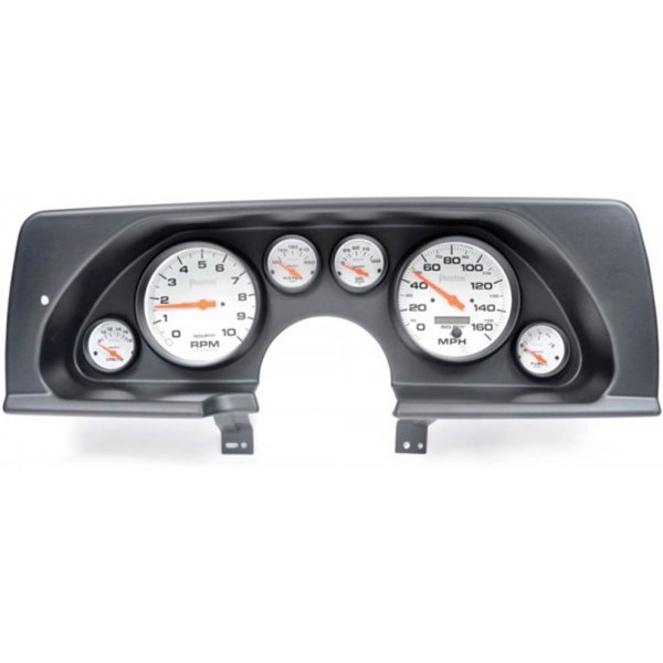 Thermoformed ABS Plastic Is Strong And Stylish Impregnated With UV Blocker To Protect From Sun Damage Includes Autometer Phantom Gauges & Harness That Connects To Stock Dash Wiring Kits Also Include LED Turn Signals,High Beam,& E-brake Indicators 5 10,000 RPM Tach, & 160 MPH Speedometer 2-1/16 Voltage,Oil Pressure,Temperature, & Fuel A new instrument cluster is the best way to end or begin your Camaro's restoration. The base panel is made of multiple layers of tough ABS plastic that is vacuum formed at 320*F. They are machined on a 5-axis CNC to insure a perfect fit to your dash. The kit includes Autometer Phantom series gauges which are all electrical. LED's are also included for the turn signal, high beam, and parking brake indicators.