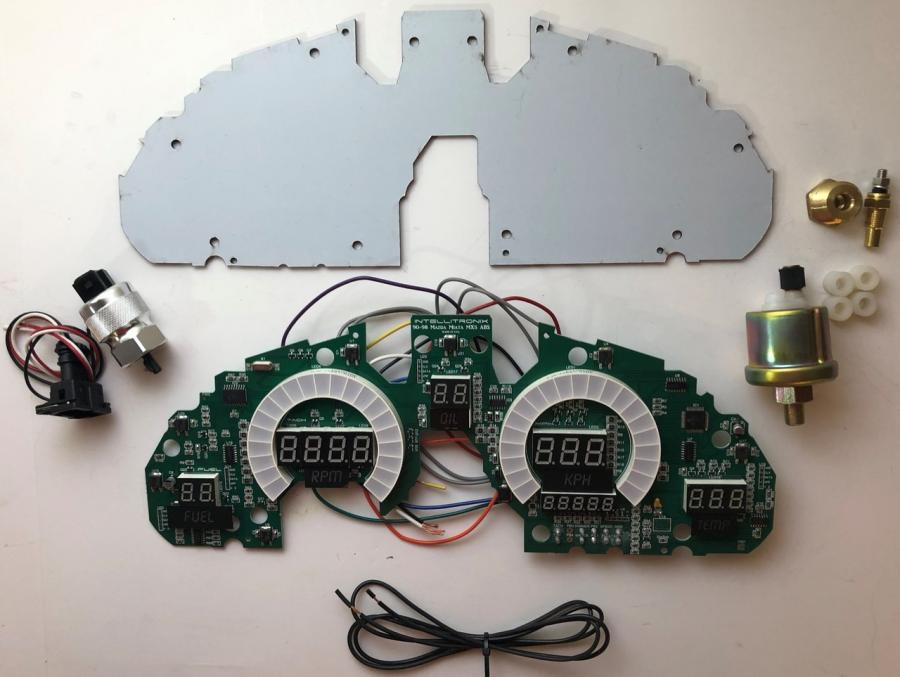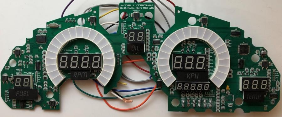 Cruise in style in your 90-98 Mazda Miata with Intellitronix 1990-1998 Mazda Miata LED Digital Replacement Gauge Panel. Included in this complete set is a direct fit printed circuit board, custom fit "smoked" plexiglass faceplate, universal temperature sending unit, oil pressure sending unit, and speedometer sending unit with sender and sensor for vehicles without electronic transmission or cruise control, and instructions for installation.