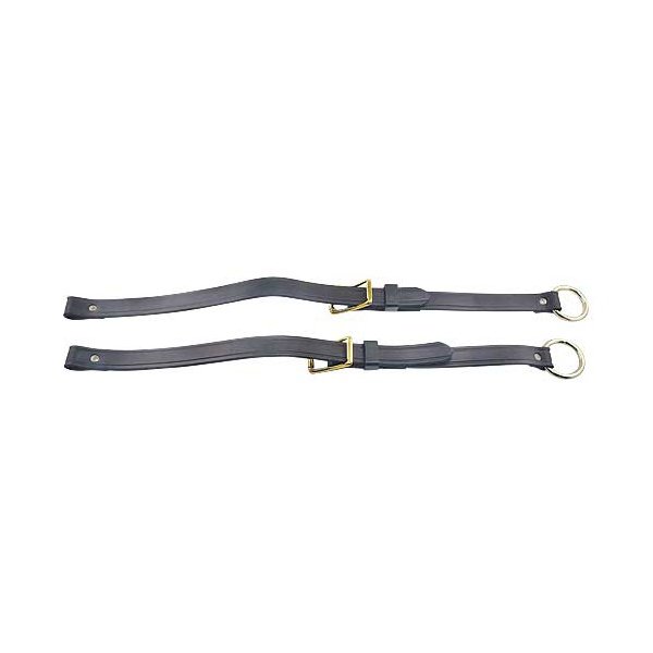 These straps take the stress off the rear curtain when the top is up. They are made of black leather and include "D" rings and brass buckles. Use with original footman loops.