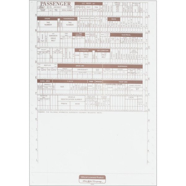 We have the original style build sheets for most years of Galaxie. The build sheet was the document that was used on the production line to properly code all of the factory specifications on your car. As the car was on the assembly line, this sheet would be used to properly install the specified features. These are a blank template build sheet without codes included. You can add the codes to this sheet for your particular specifications to reproduce your original. Because these were normally mounted in the springs of the seat, these are usually in poor shape if located in your car.