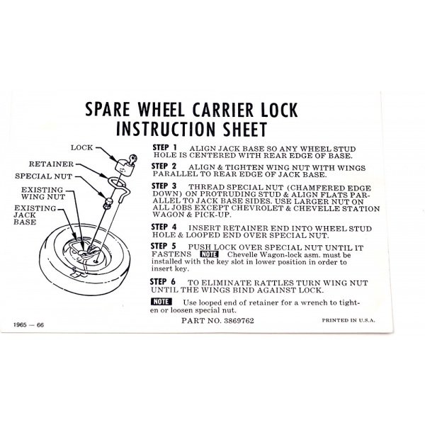 Chevelle Spare Wheel Carrier Lock Instruction Sheet, 1965-1966: