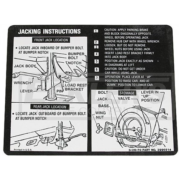 Reproduction Of Original For Use With El Camino's And GMC Sprints This El Camino reproduction jacking instruction decal has been manufactured to original factory specifications using today's modern manufacturing techniques. You will find the fit, finish and function will work superbly for your restoration. In addition, using a reproduction jacking instruction decal from the El Camino Store will add authenticity and value to your vehicle.