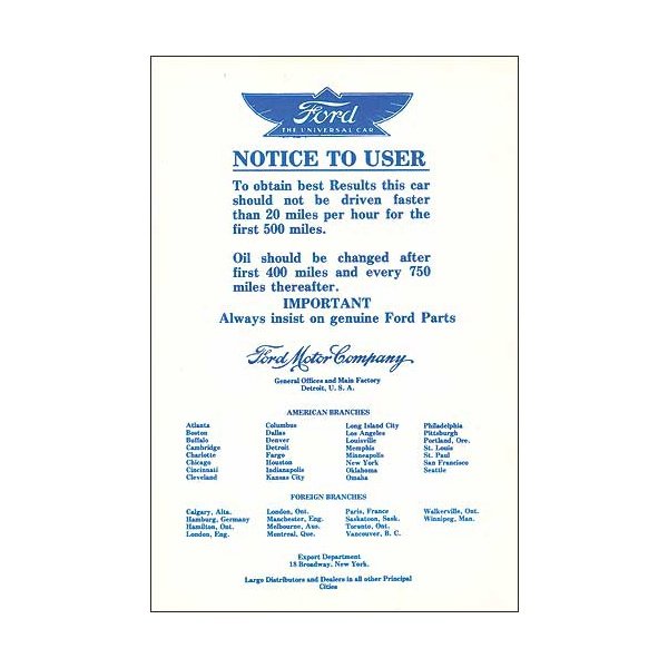 A notice for new Model T owners, containing advice for breaking-in their new vehicle. Also included is a listing of all Ford Motor Company branches, both domestic and foreign.