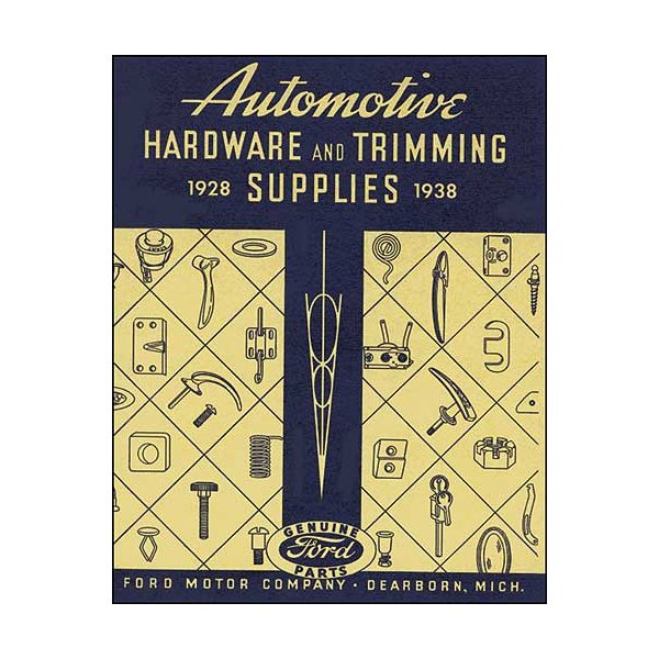 This manual contains photos and dimensions of all 1928-1938 Ford trim parts. It includes original Ford numbers and vehicle applications for everything from striker plates and window regulators to upholstery tacks.