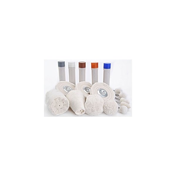 This deluxe polishing kit is designed for steel, stainless, aluminum and plastic automotive components. Utilize your electric drill or pneumatic die grinder with the supplied 1/4" arbors for polishing jobs on or off the vehicle. Kit includes 4 oz tubes of Emery, Tripoli, Jewelers Rouge and White rouge along with an assortment of tapered, cylinder, spiral and wheel buffs for tight spots and open surfaces such as valve covers or air cleaners.