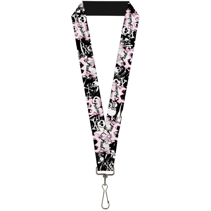 Buckle-Down Lanyard - Punk Princess Heart Cross Bones/Skulls Splatter B/W: