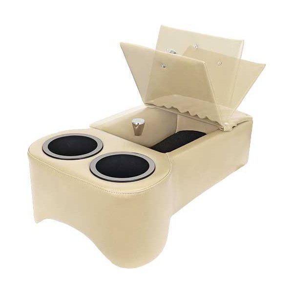 For those of you who don't want a console sharing the front seat with you, we'd like to introduce our new Low-Rider Floor Console. Specifically designed to sit on the transmission hump, it has two bendable aluminum plates that act as legs to help keep it in place. Like our seat consoles, this, too, is upholstered in long-wearing, automotive-grade vinyl with double-stitched French seams. It features two king-sized drink holders & a large storage compartment with a hinged lid. That hinged lid has a convenient storage pouch sewn onto it to hold your sunglasses, cell phone, or a map or two. With a choice of 12 beautiful colors, you can certainly find one that will complement your interior.