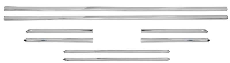 Reproduction of the original lower body moldings designed for use with 1968 Chevy II and 1969-74 Nova deluxe models. Each bright finished aluminum molding is designed to match factory specifications replicating the original for an authentic appearance and fit. This molding kit mounts about 5 inches above the rocker panel molding, on the fender behind the tire, the door, and in front and behind the tire on the quarter panel. 8 piece kit.