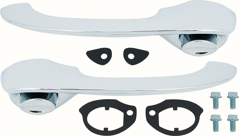 Reproduction of the original outer door handles designed for use on 1968-79 Chevy II, Nova and X-body models. Replace your original pitted or worn-out outer door handles and give your restoration the look it deserves with this comprehensive complete set including the door hanels, push buttons and hardware. Each handle is manufactured in die-cast zinc and triple chrome plated. Manufactured to exact factory specifications that will replace the original outer door handles exactly.