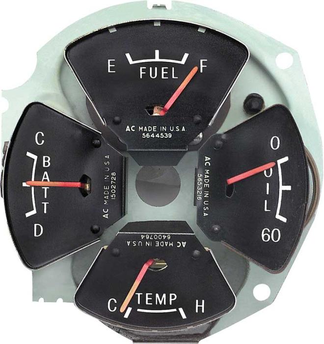 A high quality reproduction of the original instrument gauge cluster designed for use on 1963-64 Chevy II / Nova SS models. Each gauge cluster is manufactured to exact factory specification and includes the fuel, oil, temp and battery gauges with correct lettering. This gauge is pre-calibrated and tested in ensure functionality when installed. Replace the old, or non-working gauge with this quality OER® reproduction.