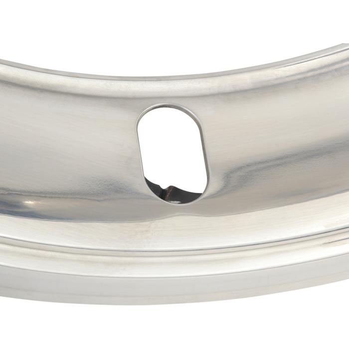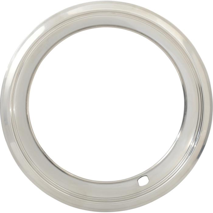 Replacement Rallye wheel trim ring. Features correct contours and a polished stainless steel finish. Will fit 14" x 6" or 14" x 7" wheels. Sold individually. Measures 2-1/2" deep.