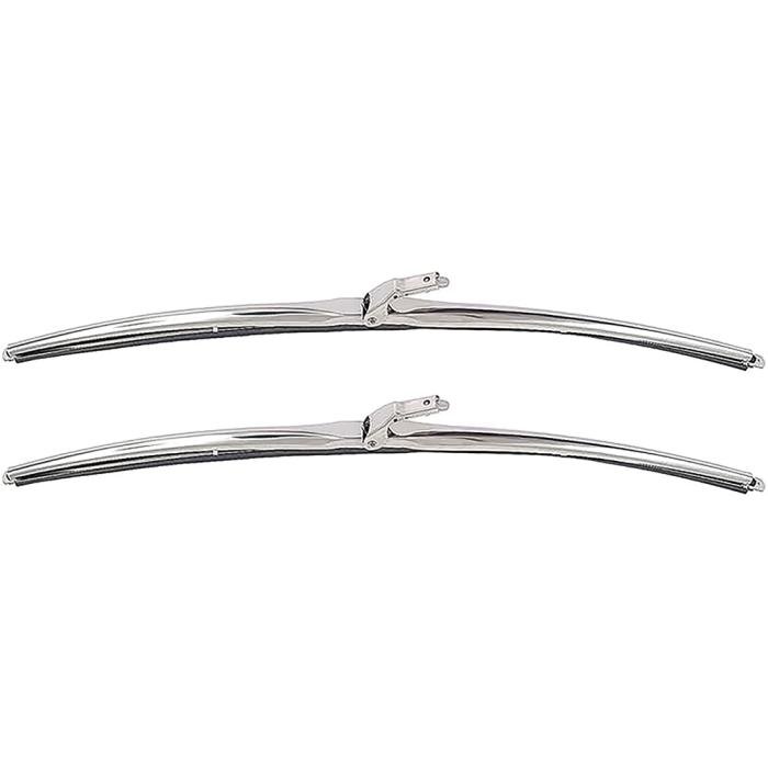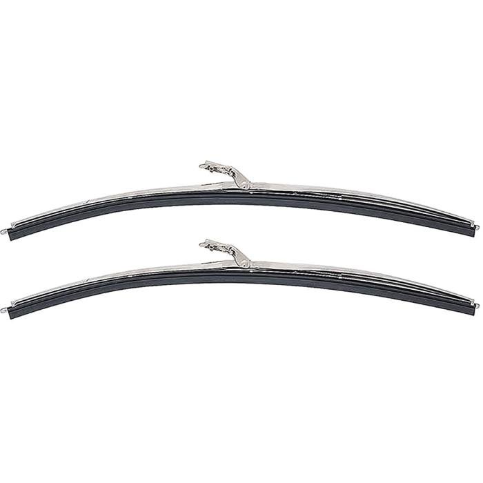 Reproduction 16" wiper blade assembly set manufactured to factory specifications, featuring a bright polished stainless steel finish and premium wiper inserts. Designed to fit 1/4" bayonet end wiper arms for factory-style installation. Sold as a pair.