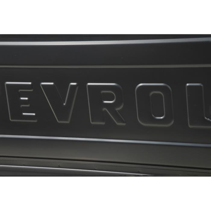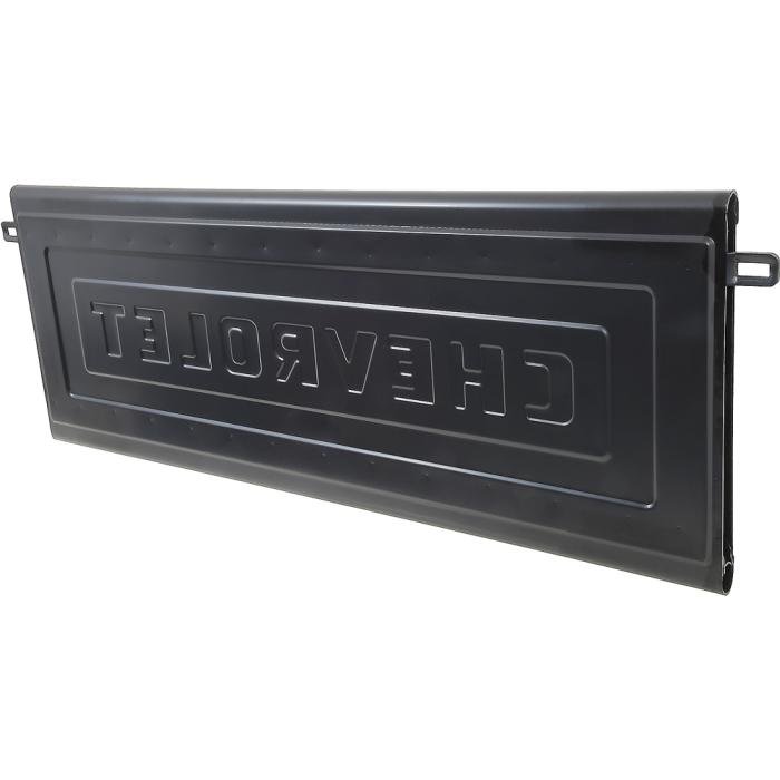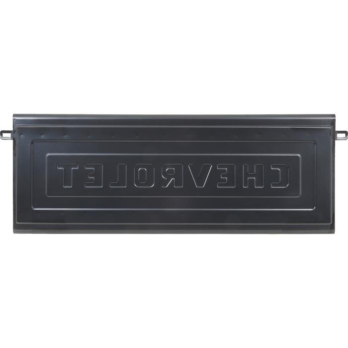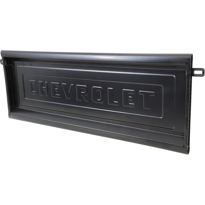 Reproduction tailgate with original style embossed Chevrolet lettering. Manufactured from 16 gauge electro-galvanized steel, each tailgate features welded construction, accurate bends, dimensions for a perfect fit to replace the damaged or rusted original. This tailgate includes the chain latch brackets.