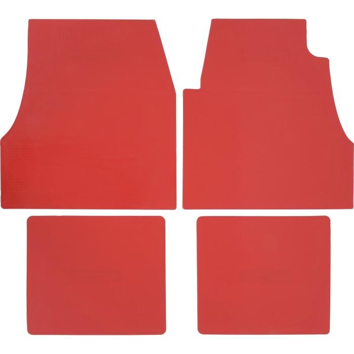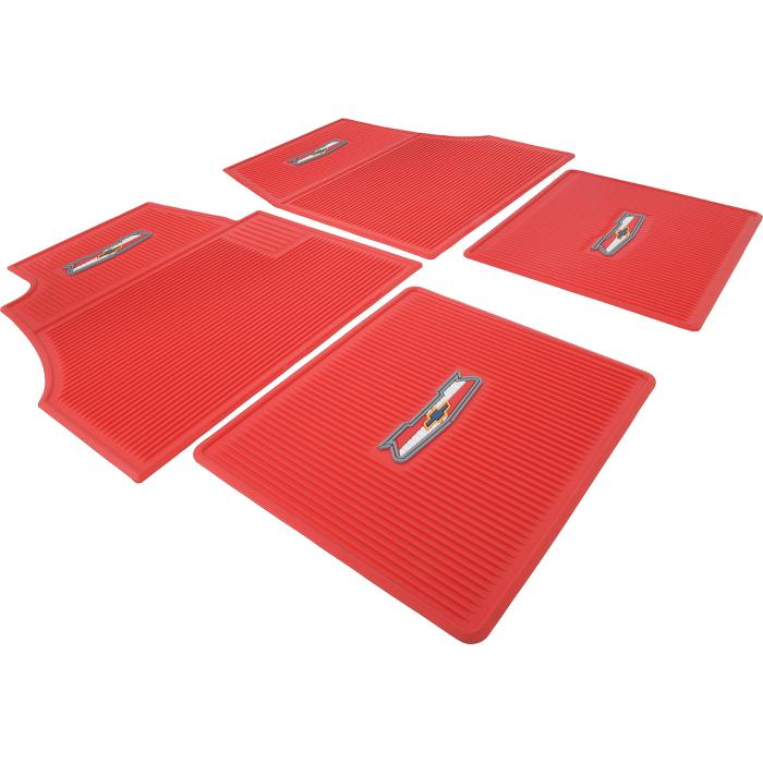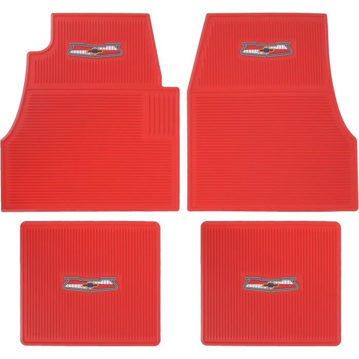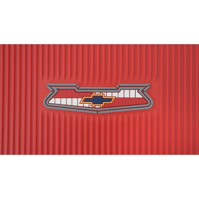 Protect your interior carpet and give your Tri-Five a unique look by adding these custom style floor mats for front and rear. Floor mats are designed for use with all 1955-57 Chevrolet Bel Air, One-Fifty Series, Two-Ten Series, Nomad, and Del Ray models. Front and rear mats display the colorful "Chevrolet" crest logo featuring a blue Bow Tie in the correct early style design. These custom floor mats feature a horizontal ribbed design that harkens back to the days of yesteryear offering a retro look. These custom mats are manufactured in high-grade automotive Plastisol material that offers years of long-lasting durability. Front and rear floor mats (4 piece set).