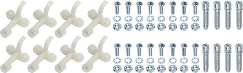 Replace damaged or missing headlamp adjusters with these quality reproductions. Each set includes 64 Pieces - (8) adjusting screw, (8) plastic adjusting nut, (16) mounting screws with (16) washers and (16) nuts. 1 set is required for 4 headlamp system. 1 set will be enough for two vehicles that have a two headlamp system. Fits a wide variety of GM vehicles from 1940-65. Replaces GM part # 5949838. Includes bracket, adjuster screw and attaching hardware.