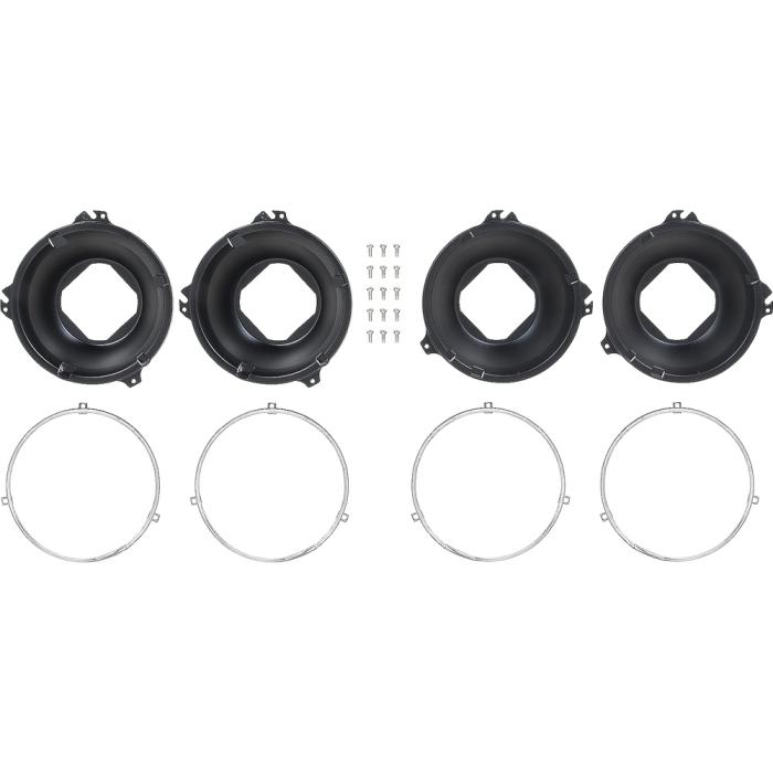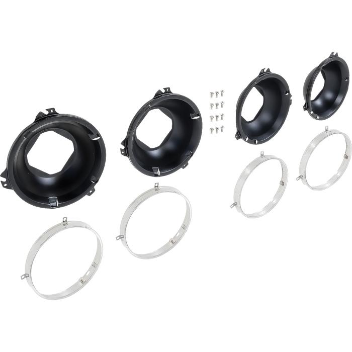 Reproduction of the original headlamp mounting set designed for use on various Chevrolet and GMC truck models. This set includes four 3-tab stainless headlamp retaining rings, four EDP coated "square-hole" style headlamp buckets, and the 12 screws needed to secure the trim rings to the bucket.
