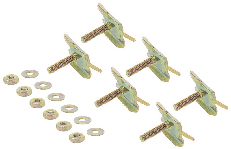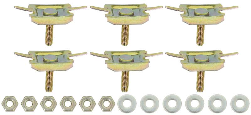 Reproduduction of the original trunk molding clips designed for use with 1962-67 Chevy II and Nova models. Each clip is manufactured to factory specifications for an authentic appearance and fitment. Includes 6 each clips, nuts, and washers. Used to attach molding # 13931.
