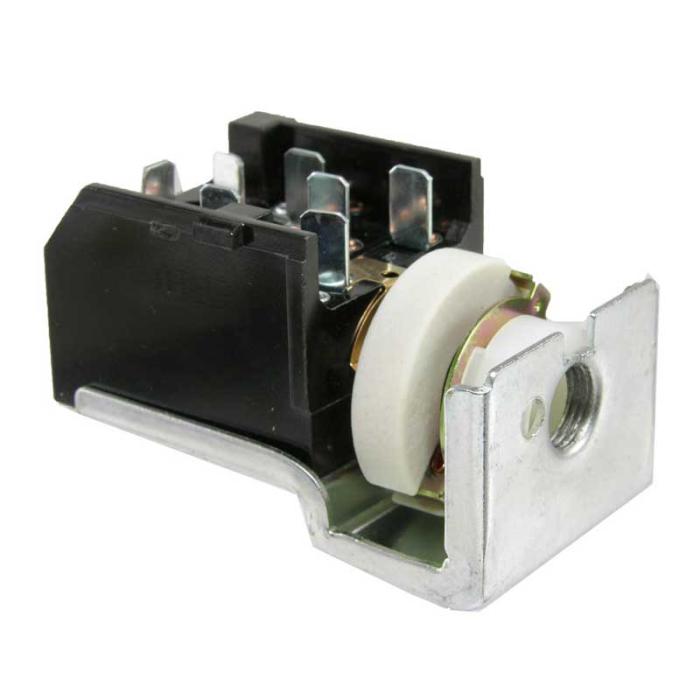 Reproduction headlamp switch for various 1962-76 Mopar A and B-Body models. This 7 terminal switch does not have a ground terminal on the bottom of the backside or rear of switch. This switch features a 1-5/8" ceramic insulated rheostat. X Terminal = 20.5 Ohms. Replaces OE Mopar part #'s 2584928, 3514427, 3671981.