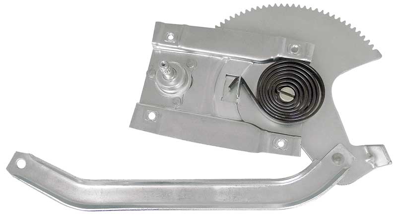 Reproduction window regulator for 1965-66 Mustang models with the screw-on style window crank handles. Each window regulator assembly is manufactured in stamped steel and cadmium plated for corrosion and rust resistance. Replicates the original in design, appearance, and functionality.