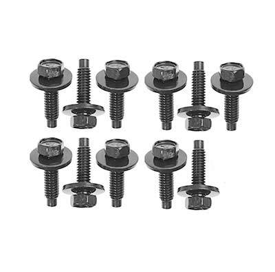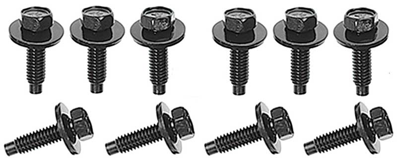 Reproduction door hinge bolt kit with washers for late 1965-66 Mustang models. Each kit includes 11 bolts with washers, enough to do one door. Two kits are required per vehicle.