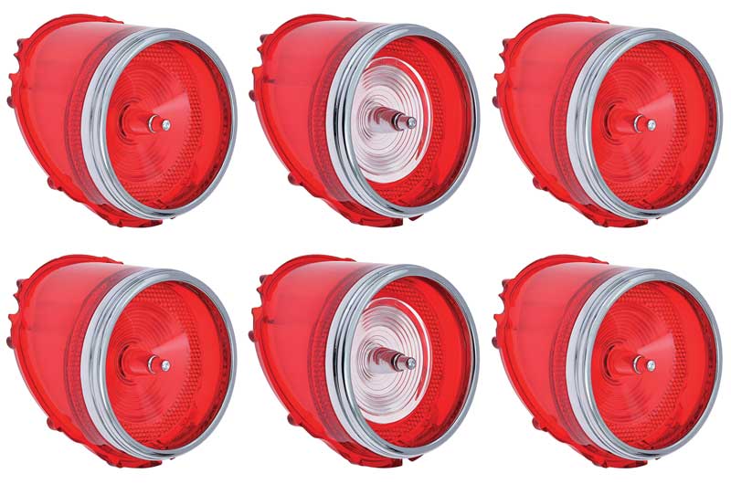 Reproduction of the original rear tail lamp lens and back-up lamp lens set designed for 1965 Impala models. This 6-piece rear lens set includes 4 rear red tail lamp lenses and 2 back-up lenses. These injection molded lenses are produced in UV stable acrylic in the proper color and feature correct SAE and "Guide" markings as original. Each lens also features the chrome plated trim ring and center tip ornament pre-attached.