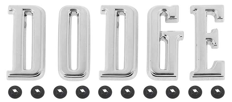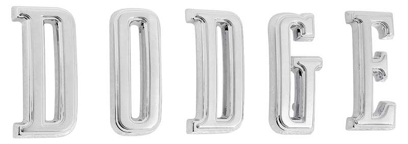 OER reproduction of the original "D-O-D-G-E" hood emblem letters for 1966 Dodge Coronet or Charger models. Each letter is manufactured in die-cast zinc as original, and chrome plated to offer an authentic replacement of the old, missing, broken, or pitted original emblems. Comes with mounting nuts for your convenience.