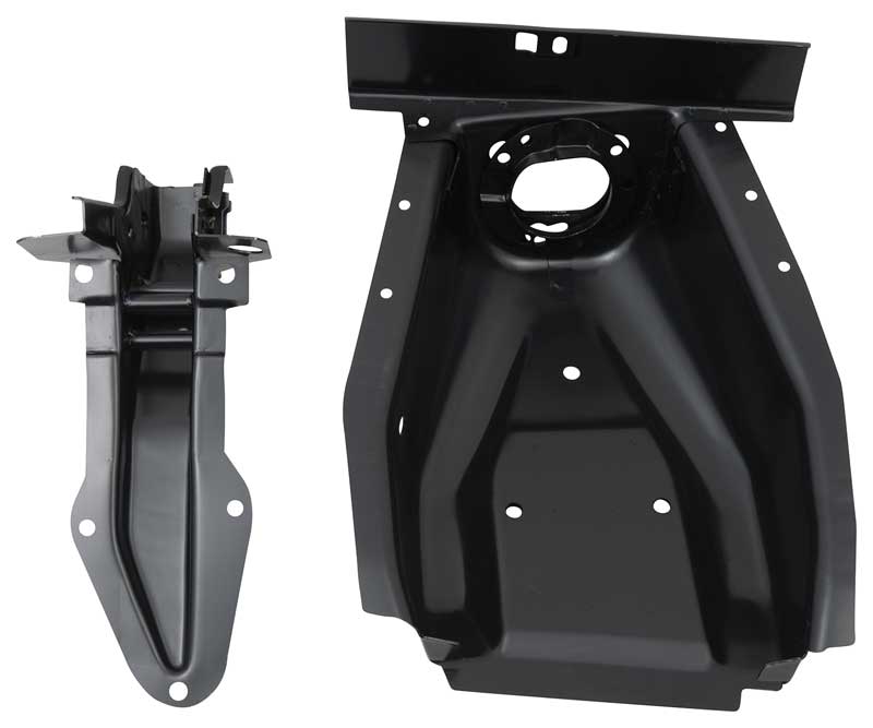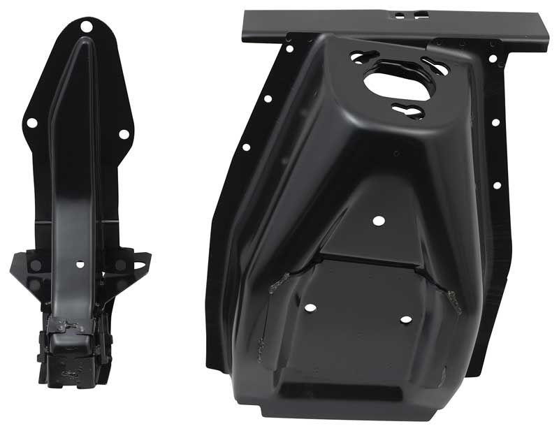 This part of the vehicle's unibody is frequently cracked from suspension stresses, or damaged with drilled holes. High quality reproductions are available in basic shell form; or as a complete tower including motor mount/crossmember support structure.