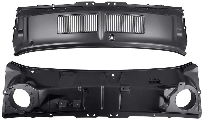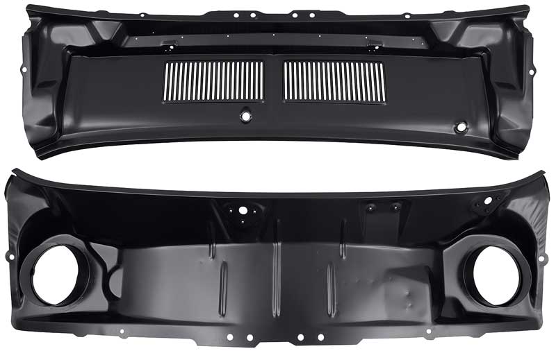 Reproduction of the original cowl grill panel assembly designed for use with 1967-68 Ford Mustang models. Each cowl grill panel is manufactured in stamped steel to original factory specifications featuring correct contours for an authentic appearance and fit. Features the correct grill design for an authentic factory appearance. Includes the upper grill panel and lower cowl panel. Comes with a black EDP coating for rust and corrosion prevention.