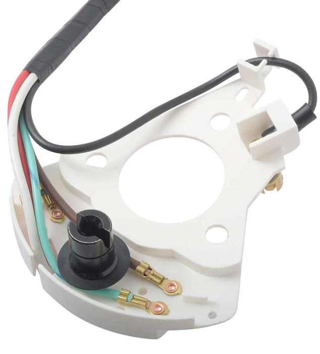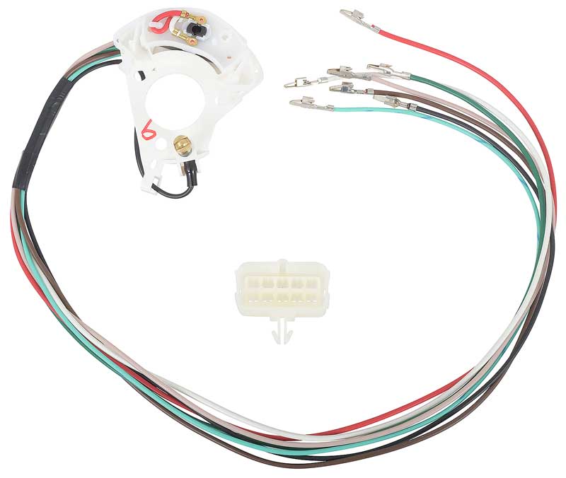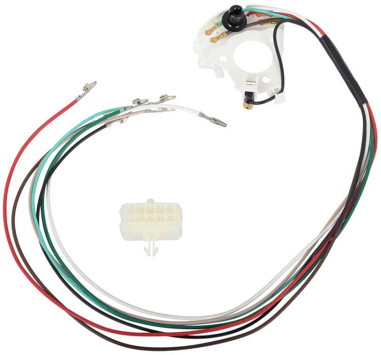 Reproduction "Final Design" turn signal switch for 1967-71 Mopar A, B, C, & E-Body models without tilt wheel. This switch comes with metal connectors attached to the ends of the wires and includes the plastic connector for a solder and splice-free plug-in installation. 2-3/4" from outside of arm to outside of arm.