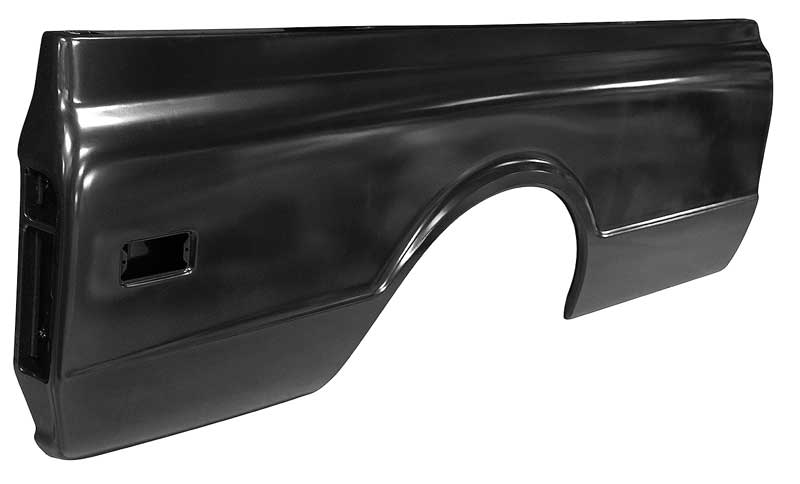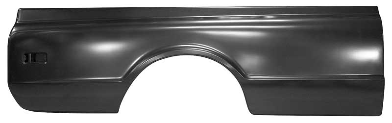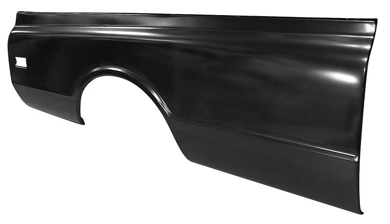 Reproduction bed side panel for Chevrolet and GMC Fleetside Pickup truck models with the 8' long bed. Each panel is manufactured in quality stamped steel to OE specifications ensuring an authentic appearance and fit. Each panel features stake pockets and side marker holes. Note: This bedside panel is factory correct for 1968-72 models, but will fit 1967 by filling the side marker opening, or adding a side marker lamp.