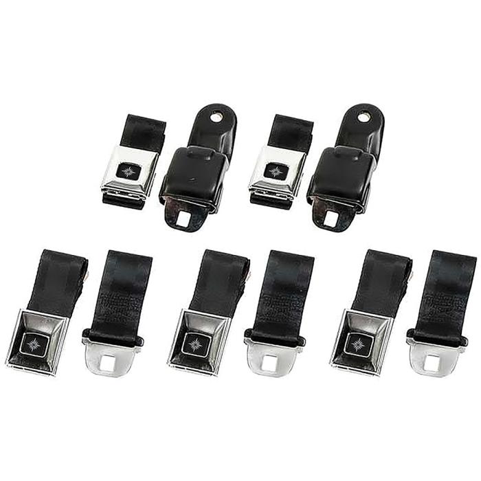 Our new reproduction seat belt assemblies feature a high grade, blow-formed ABS housing that attaches to the floor and allows the seat belt to retract into place, an original-style webbed design belt featuring the correct patterned stitching and a correct seat belt retractor/roller assembly (front belts only). Set includes 2 front bucket seat belts, and 3 rear seat retractable lap-belts.