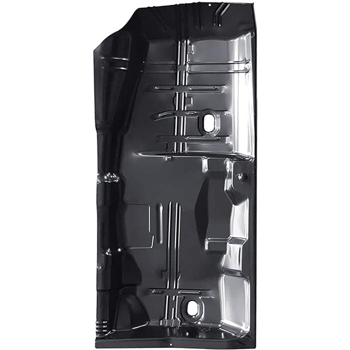 Reproduction RH floor panel for 1968-72 Chevelle and other GM A-Body models. Each floor panel is manufactured in stamped steel to factory specifications featuring correct contours for an authentic appearance and fit. Extends from the rear seat section to the firewall extension. This floor pan features additional metal which extends upward near the transmission tunnel allowing more coverage than other floor pans currently on the market. Black EDP coated for rust and corrosion prevention. RH, passenger side of the vehicle.
