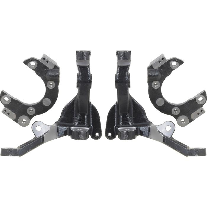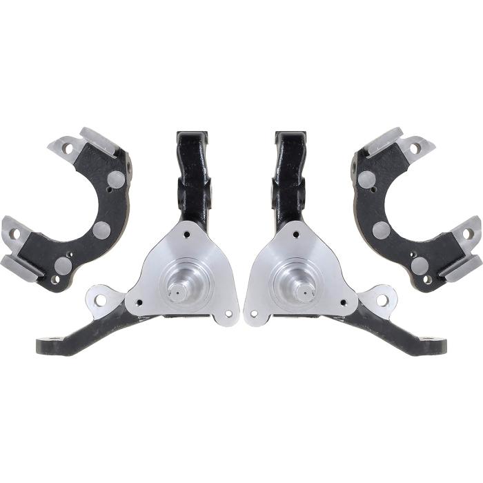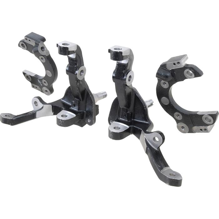 Heavy-duty 1970-73 Mustang V8 style big bearing disc brake spindle and bracket set for various 1960-77 Ford and Mercury models including Mustang, Cougar, Falcon and Comet. These high quality Mustang spindles are manufactured with modern steel alloys for improved durability and strength over the original spindles. These new spindles share Ford's original geometry, designed to be coupled with 1970-73 OE-style disc brakes or aftermarket brakes. Sold as a pair