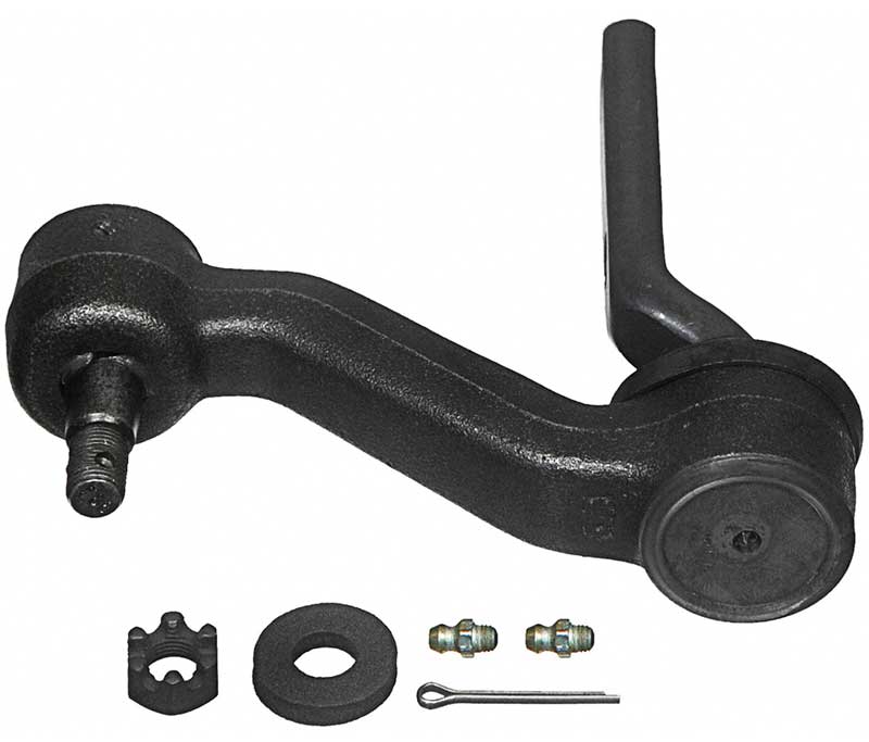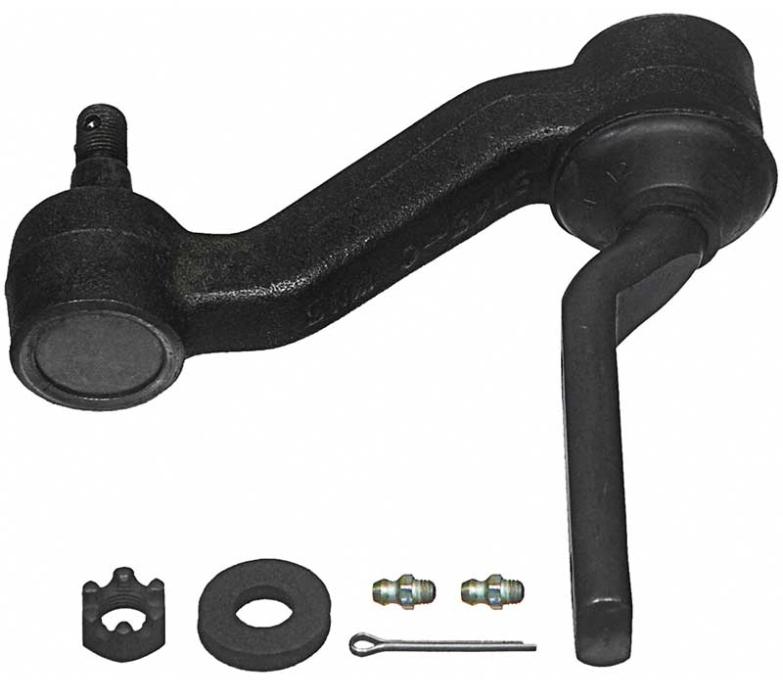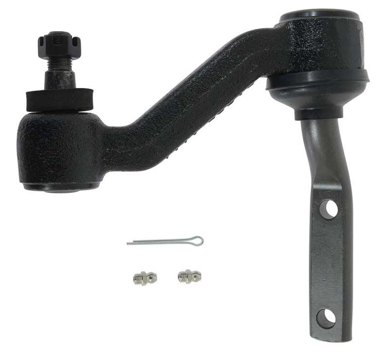 Reproduction of the original idler arm assembly designed for use with various 1968-74 Camaro, Firebird, Nova, and GM X body models. This pivoting support for the steering linkage appears on older recirculating ball-type steering systems (pre-rack & pinion) and functions like the pitman arm in a rack and pinion system. This black, cast-iron steering arm features two holes for mounting to the frame, a rubber boot on the mounting section of the idler arm and also includes two fittings and a hex-nut with slots in it to retain a cotter pin.
