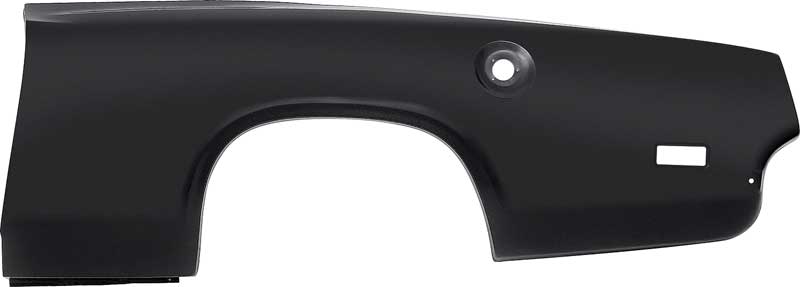 Reproduction of the original quarter panel skin designed for use with 1969 Plymouth Barracuda models. Each quarter skin panel is manufactured in stamped steel to original factory specifications featuring correct contours for an authentic appearance and fit. The partial quarter panel skin extends to the top crease of the original quarter panel and is die-cut so it extends to all mating surfaces including door jamb, wheelhouse, and tail light/valance panel area. The panel includes pre-cut opening for fuel cap and side marker lamp in the correct locations. Features black EDP coating for rust and corrosion prevention.