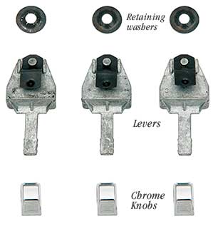 Reproduction of the original casted heater control levers designed for use on various GM models. Includes 3 precisely stamped levers, 3 original style chrome knobs and mounting hardware. Manufactured to original specifications, lever sets will install properly on reproduction or original GM heater control assemblies.