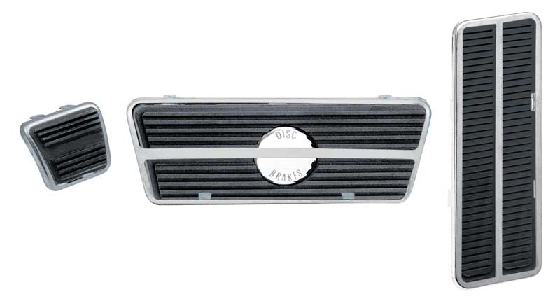 Reproduction of the original pedal pads and pedal pad trim plates to fit various GM models. This pedal pad set is designed to replace the worn out original pads for models equipped with disc brakes and automatic transmission. Replacing the pedal pads will renew the appearance of your interior while maintaining originality. Each 6-piece kit includes the brake pad with "disc brake" center emblem insert, accelerator pad, park brake pad and stainless trim for each pad. Correct for 1969-71 models that featured the "disc brakes" emblem, but will fit up to 1981 models as listed.