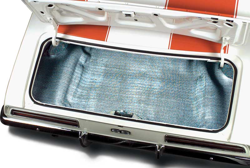 Authentic reproduction trunk mat is heat molded to fit the trunk pan then die-cut to the exact dimension of the original mat. The correct black/aqua Houndstooth pattern offers a completely original appearance. The mat is manufactured for coupe models( convertible models require minor trimming around the rear convertible weight dampeners).