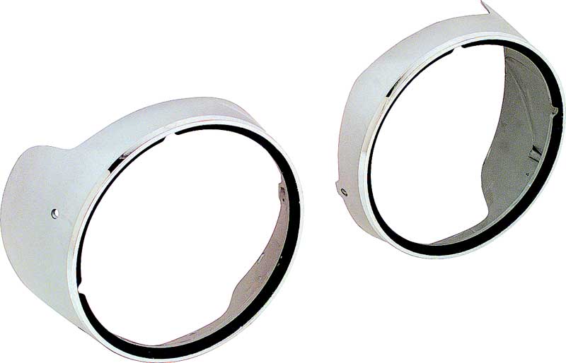 Reproduction headlight bezel for 1969 Camaro standard models with the optional exterior decor package. Each bezel is manufactured in injection molded ABS to exact factory specifications and features a bright polished chrome ring matching the original bezel. The bezel is manufactured in the correct textured argent silver color. For use with standard (non RS) Camaro models with the optional exterior decor package that included wheel well moldings, quarter panel louvers, and roof drip moldings; Not for use with RS models.