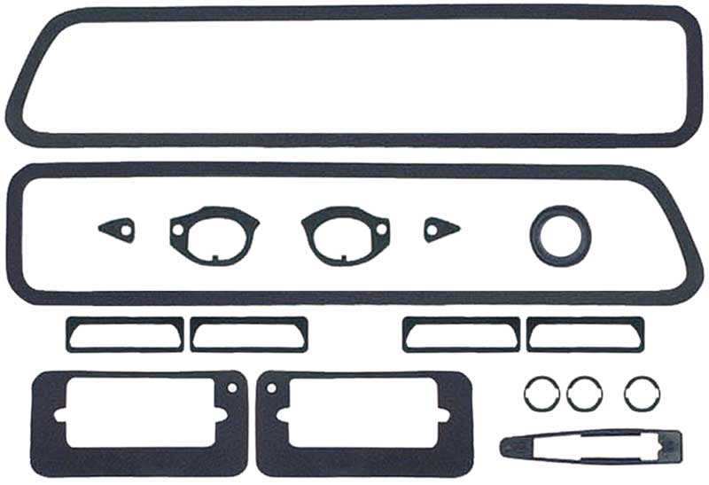 A complete set of reproduction exterior gaskets designed for use on 1969 standard or RS Camaro models. Each set is designed to replace the gaskets for the door handles, tail lights, back-up lights, side markers, mirror gasket, antenna base, door lock cylinders and trunk lock gasket. This highly recommended replacement set will prevent dust and moisture from entering crucial areas where paint can chip and crack.