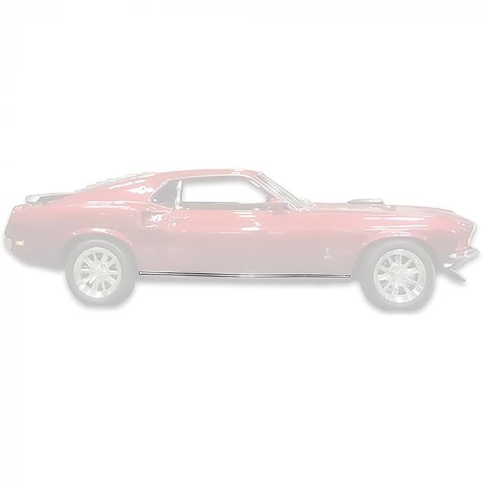 Reproduction rocker panel molding that runs along the outer rocker panel of the exterior on your 1969 Mustang just below the door. Each molding is manufactured in quality stamped aluminum replicating the original in quality, design, and fitment. Includes hardware for installation.