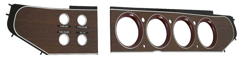 Reproduction of the original Rallye Gauge panel and switch plate designed for use on 1970-71 Plymouth Barracuda, Cuda, and Dodge Challenger convertible models. Original bezels that are scratched, damaged or covered in overspray can be very difficult to repair. The woodgrain finish on this aluminum bezels is not a decal. Each woodgrain panel utilizes screened print just like the originals. 4 switch design with marked top lift. Note: This panel is stamped from a flat aluminum panel, minor bending of panel is necessary before installation to get proper curvature in the corner area.