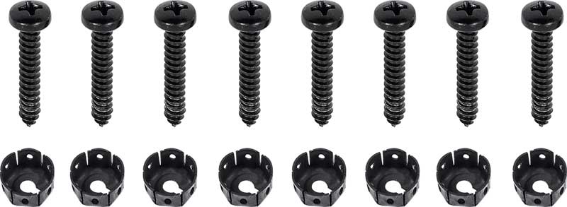 Reproduction of the hardware set used to attach the park lamp assemblies to the "Sharktooth' grill on 1971-72 Dodge Dart and Plymouth Duster 340 with the Sharktooth grill. This is a set of 8 nuts and 8 screws to attach both park lamp assemblies. These special nuts attach to studs on the grill and the screws then hold in the assemblies.