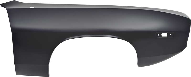 Reproduction of the original front fender panel for use with 1972-74 Plymouth Barracuda models with side marker lamp cut-out area. Each front fender is manufactured in quality stamped steel to factory specifications replicating the original curves and configuration for an authentic replacement. Includes the correct side marker lamp cut-out section.