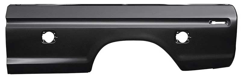 Reproduction driver-side outer bedside / bedskin for 1973-79 Ford F-Series StyleSide long-bed pickup trucks with dual fuel doors. This stamped 19 gauge steel bedside features the correct shape, size, length and holes to fit like original. Arrives EDP coated to help protect against rust and corrosion. Replaces OE # D7TZ-9927841-D