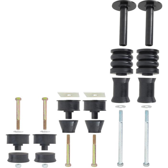 Reproduction body mounting set for 1973-1980 Chevrolet and GMC 1/2 ton or 3/4 ton 4WD standard cab pickup models. Each 28-piece kit includes radiator core support bushings, cab mounting bushings, and associated hardware. Designed to fit K10/K15 1/2 ton 4WD or K20/K25 3/4 ton 4WD standard cab fleetside pickups only. Bed mounting bolt set is sold separately. Two styles are available: T71207 features 6 short bolts and 2 long bolts, while T71207A features 8 short bolts. Both bed mounting kits are 32-piece sets that include nuts and washers.